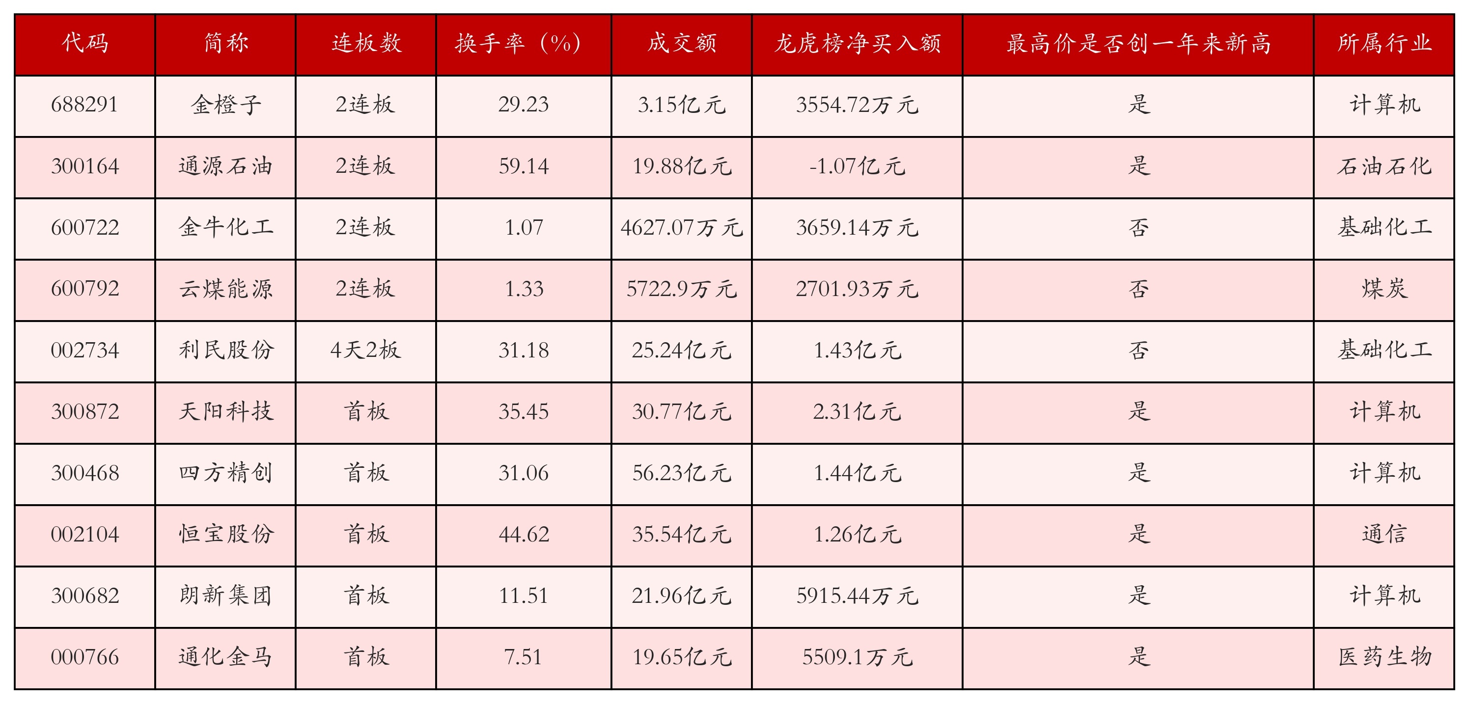 截至6月16日收盘,上证综指上涨0.35%,收于3388.73点,深证成指上涨0.41%,收于10163.55点,创业板指上涨0.66%,收于2057.32点。今日沪深两市A股共计75只涨停,综合当前连板数以及当日龙虎榜数据,其中较为强势的前三只个股分别为:金橙子(688291)、通源石油(300164)与金牛化工(600722)。今日强势个股前10位具体数据见下表: