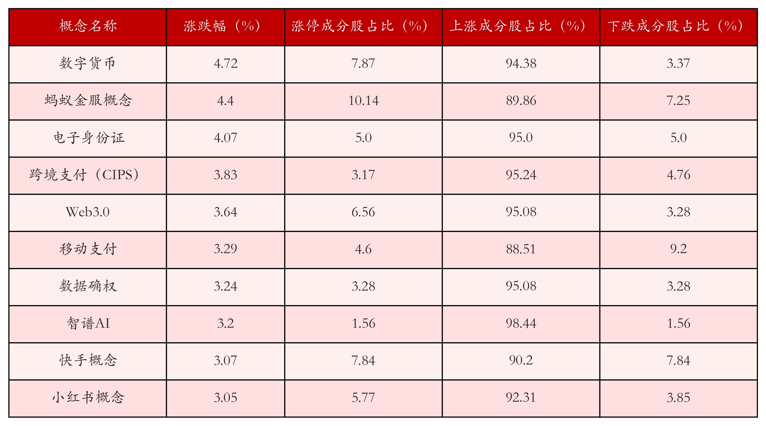 根据A股概念涨跌幅与所对应的股票池综合分析,涨幅靠前的三个概念板块分别为:数字货币、蚂蚁金服概念与电子身份证。排名前10位的概念板块相关数据见下表: